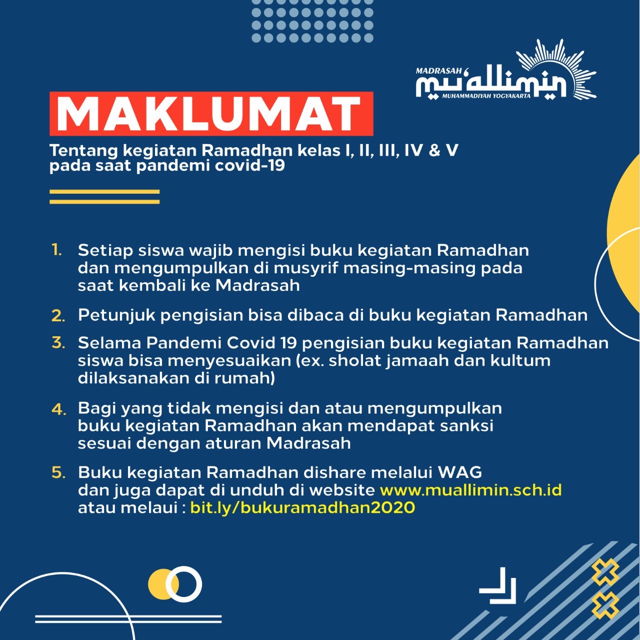 Selanjutnya, menindaklanjuti Maklumat Madrasah Mu'allimin Muhammadiyah Nomor : 1509/MLM/I.Min/F/2020 poin II C tentang kegiatan Ramadhan pada saat pandemi covid-19, maka ada beberapa hal yang perlu kami sampaikan, yaitu: