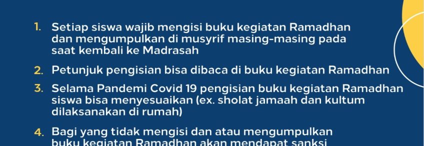 5. Bagi yang tidak mengisi dan atau mengumpulkan buku kegiatan Ramadhan akan mendapat sanksi sesui dengan aturan Madrasah.