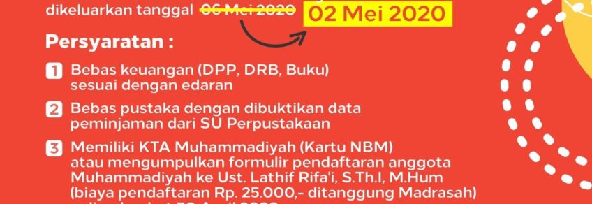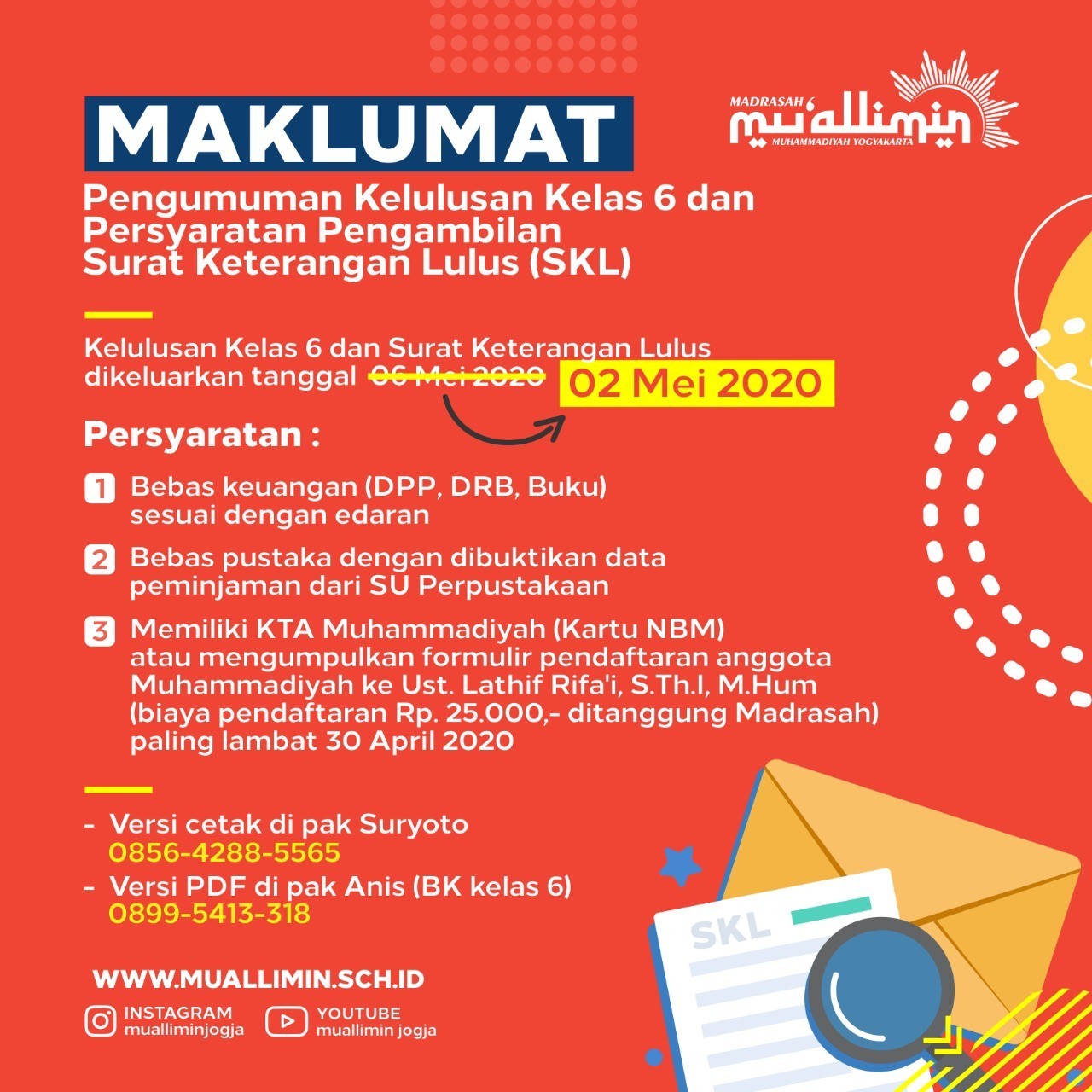 Diberitahukan kepada seluruh siswa kelas XII / Kelas VI Madrasah Mu'allimin Muhammadiyah Yogyakarta bahwa kelulusan kelas VI akan di umumkan tgl 02 Mei 2020. Bersama dengan itu Surat Keterangan Lulus ( SKL ) sudah bisa diambil dalam bentuk hardcopy maupun softcopy.