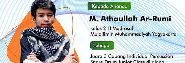 Madrasah Mu'allimin Muhammadiyah Yogyakarta mengucapkan SELAMAT kepada ananda M. Athaullah Ar-Rumi (@a.tharrr_ ) kader tingkat 2 , atas prestasi gemilang sebagai Juara 3 Tingkat Internasional dalam cabang Individual Percussion Snare Drum Junior Class pada ajang Asian Virtual Championship, mewakili Indonesia.