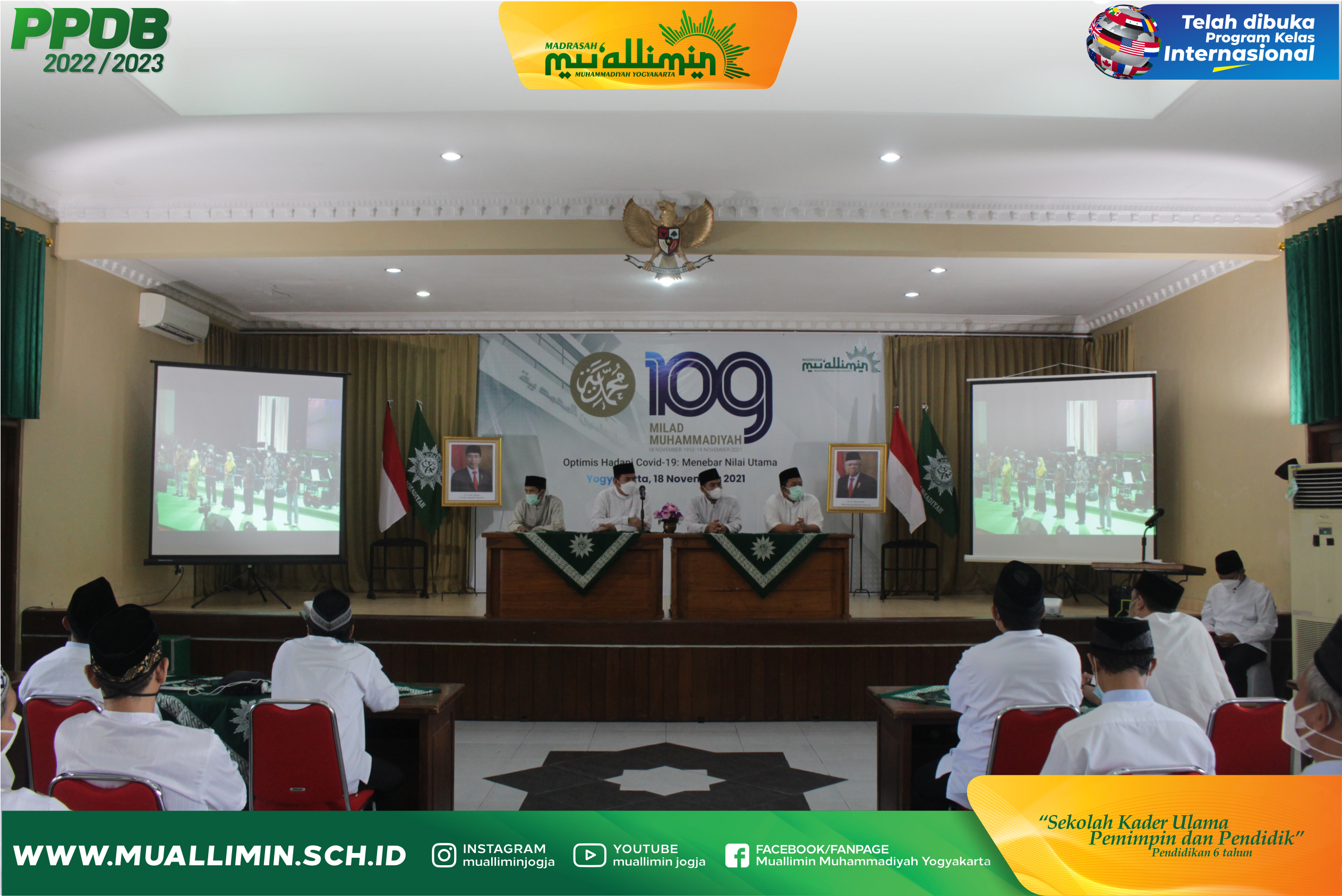 Mu’allimin Yogyakarta - Sebagai sekolah yang berada di bawah Pimpinan Pusat Muhammadiyah, Madrasah Mu’allimin Muhammadiyah Yogyakarta Mengadakan Khotmil Qur’an bagi seluruh Civitas Akademika Mu’allimin mulai dari Siswa, Musyrif, Karyawan, Guru hingga Pimpinan. Resepsi Milad Muhammadiyah ke-109 yang diadakan di Sportorium UMY Yogyakarta pada, Kamis 18/11/2021 juga diperingati di Madrasah Mu’allimin dengan virtual yang di ikuti oleh seluruh siswa dari kader tingkat 1 sampai dengan kader tingkat 6 di kelas masing-masing, sedangkan ruang aula Mu’allimin di isi oleh Guru, Karyawan serta jajaran Direksi melalui media zoom streaming.