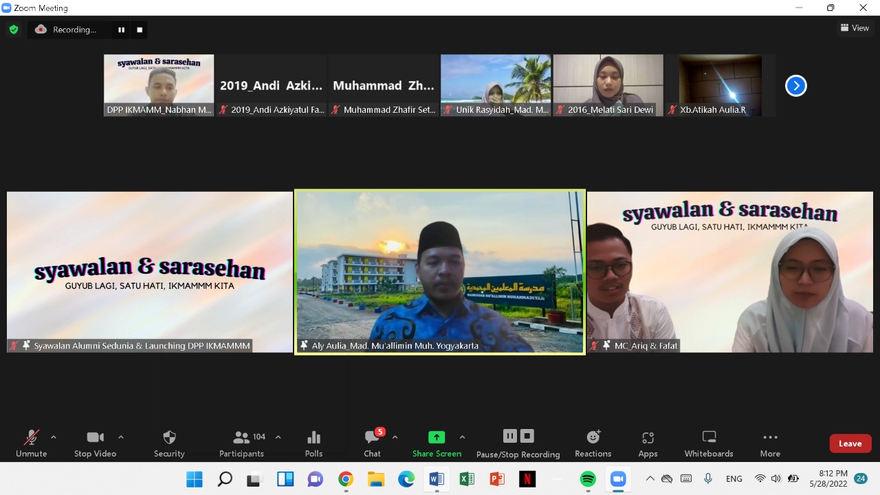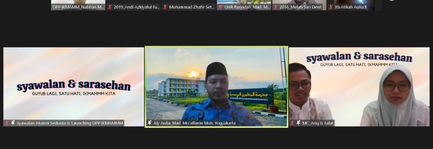 Dewan Pimpinan Pusat Ikatan Mahasiswa Abiturien Madrasah Mu’allimin Mu’allimaat (DPP IKMAMMM) Periode 2022-2023 menyelenggarakan Syawalan dan Sarasehan. Agenda yang dilaksanakan pada Sabtu malam (28/5/2022) melalui platform Zoom ini dihadiri oleh Direktur Madrasah Mu’allimin Aly Aulia dan Direktur Madrasah Mu’allimaat Unik Rosyidah juga lebih dari 100 alumni Mu’allimin dan Mu’allimaat seluruh dunia.