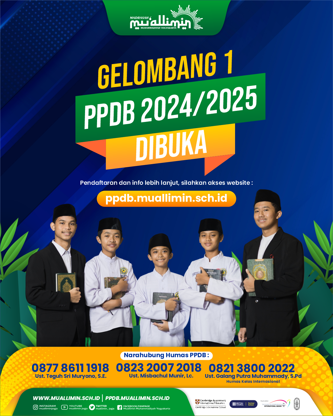 Madrasah Mu'allimin Muhammadiyah Yogyakarta adalah lembaga pendidikan 6 tahun di bawah Pimpinan Pusat Muhammadiyah membuka Pendaftaran PPDB Tahun Pelajaran 2024/2025.