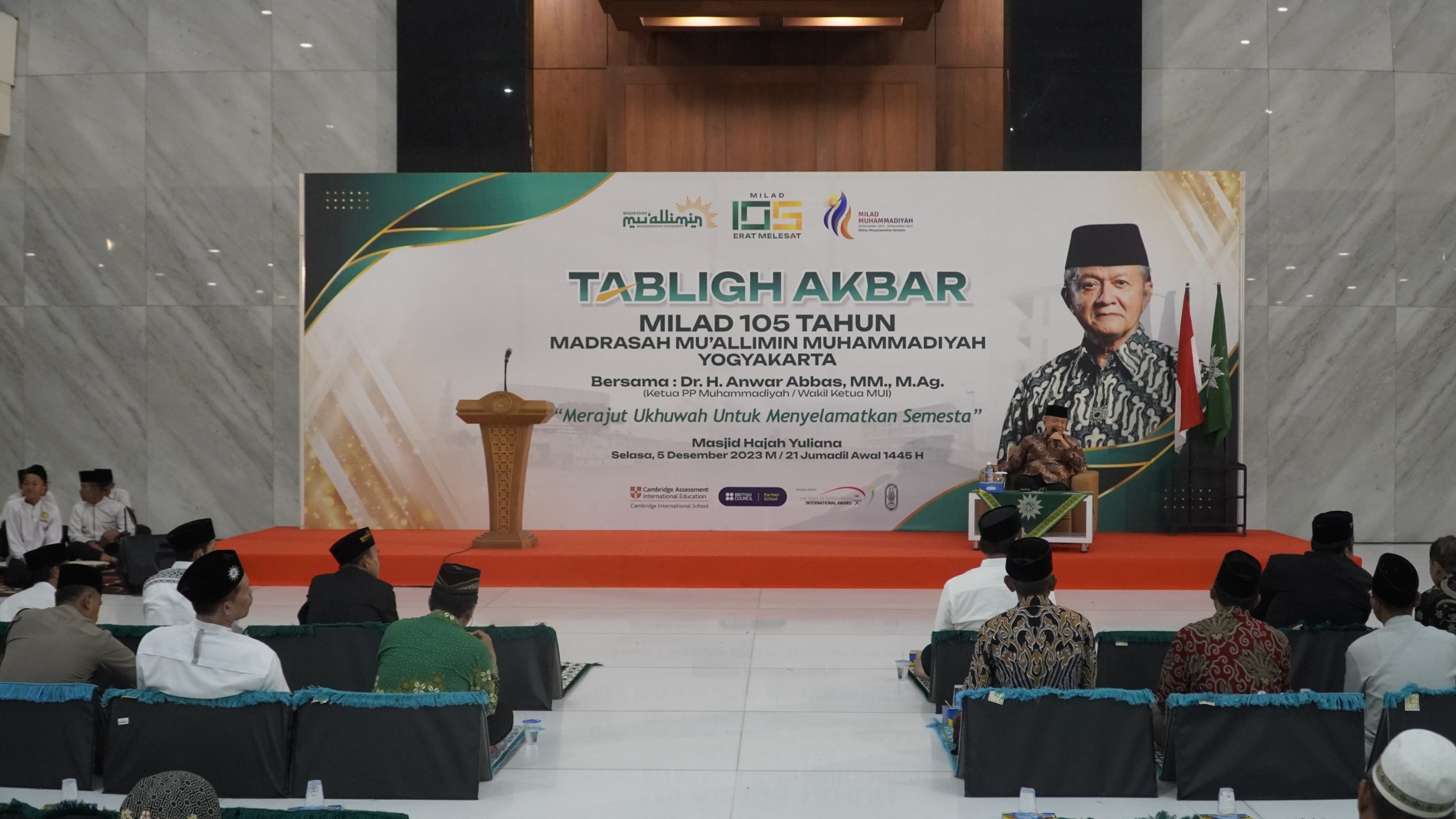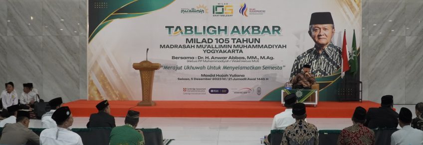 Mu’allimin, Sedayu – Dalam rangkaian Milad 105 Tahun Madrasah Mu’allimin Muhammadiyah Yogyakarta, Tabligh Akbar Kembali digelar dengan mengundang Buya Dr. H. Anwar Abbas, MM., M.Ag sebagai pemateri. Mengusung tema “Merajut Ukhuwah untuk Menyelamatkan Semesta” Tabligh Akbar digelar pada Selasa, (05/12) di Masjid Hajah Yuliana Kampus Terpadu Mu’allimin Muhammadiyah.