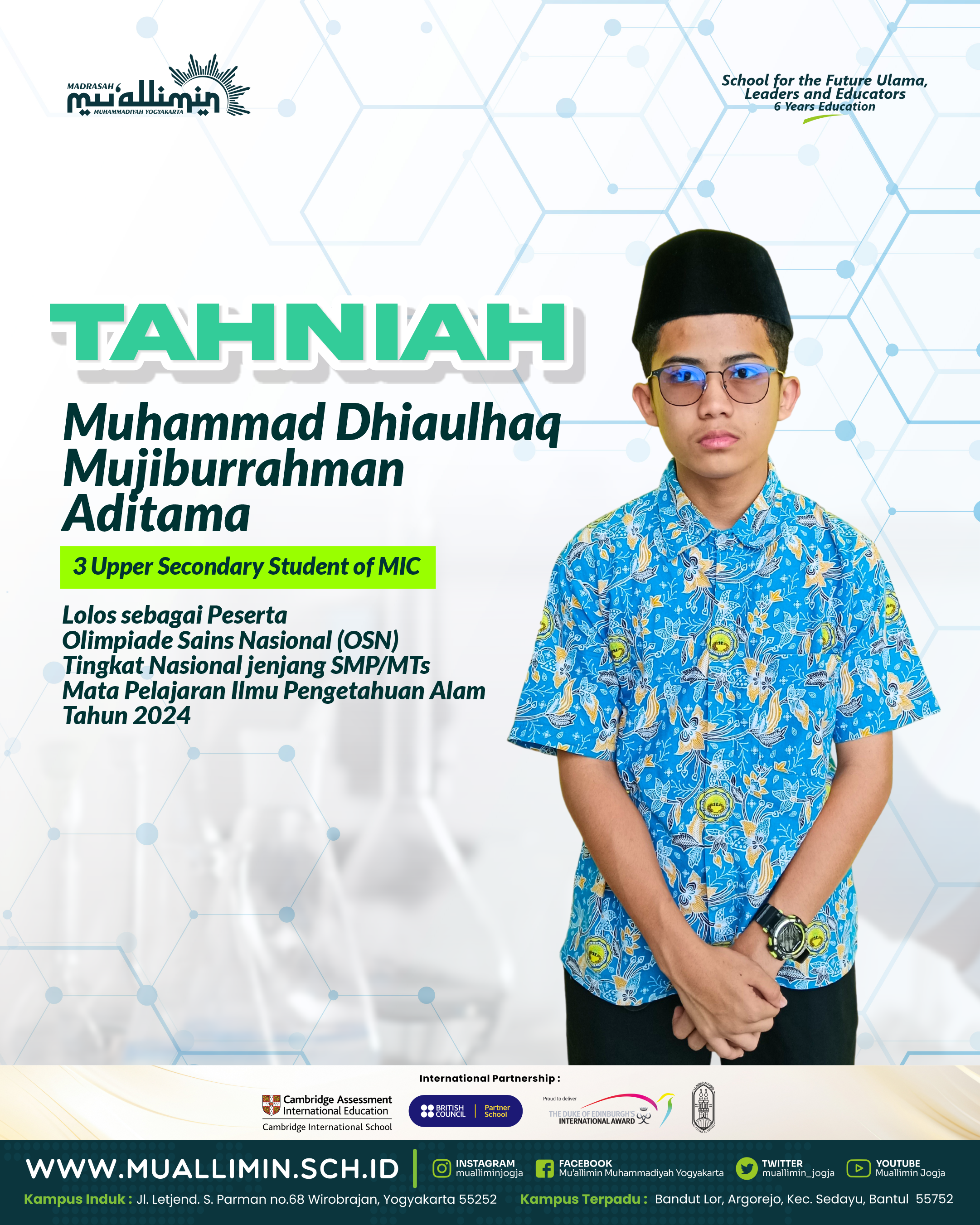 Salah satu peserta OSN Mapel IPA tingkat nasional adalah salah satu santri kelas 3 ( 9 ) Upper Secondary A (Kelas Internasional) di Madrasah Mu’’allimin Muhammadiyah Yogyakarta yaitu mas Muhammad Dhiaulhaq Mujiburrahman Aditama. Perjalanan mas aditama sapaan akrab siswa asal Kalimantan Utara ini dalam menempuh OSN tingkat nasional ini terbilang sangat luar biasa, dimulai dari OSN tingkat sekolah yang persainganya juga sangat ketat, ada sekitar 70 santri Mu’’allimin yang mendaftar di OSN IPA tersebut dan terpilih mas aditama dan juga teman sekelas aditama yaitu mas althaf.
