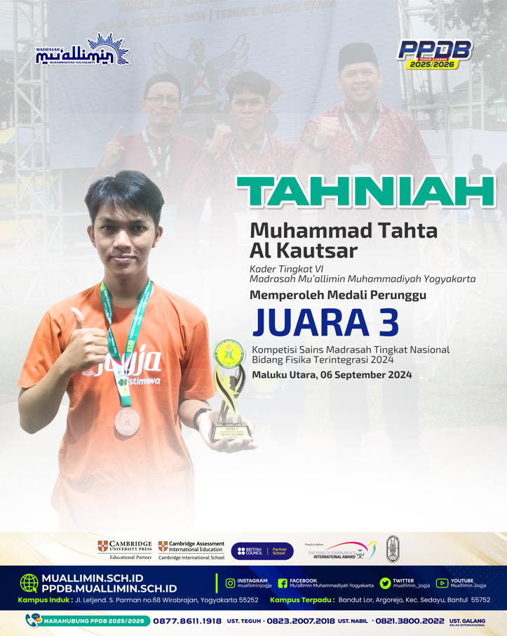 Alhamdulillah Puji Syukur kepada-Nya, Mu’allimin kembali mendapatkan medali dalam ajang Kompetisi Sains Madrasah (KSM) 2024 tingkat Nasional yang berlangsung di Kota Ternate Maluku Utara melalui wakilnya Ananda Muhammad Tahta Al Kautsar kader tingkat VI yang meraih medali Perunggu (juara ketiga) bidang mapel Fisika Terintegrasi