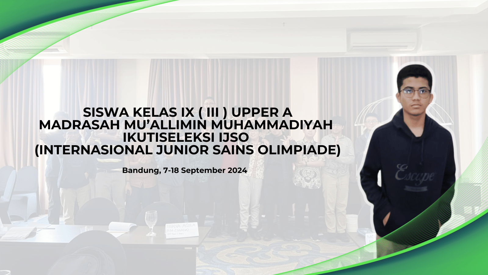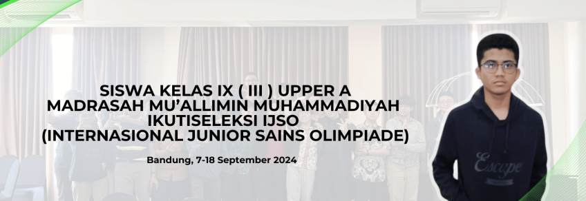 Salah satu peserta IJSO tersebut adalah siswa kelas IX (III) Upper A Madrasah Mu”allimin Muhammadiyah Yogyakarta yaitu Muhammad Dhiaulhaq Mujiburahman Aditama, siswa asal Tarakan Kalimantan Utara pada ajang OSN 2024 mendapatkan medali perak. Seleksi IJSO ini dilaksanakan dari tanggal 8 sampai 17 September 2024 di Hotel Grand Tebu Bandung.